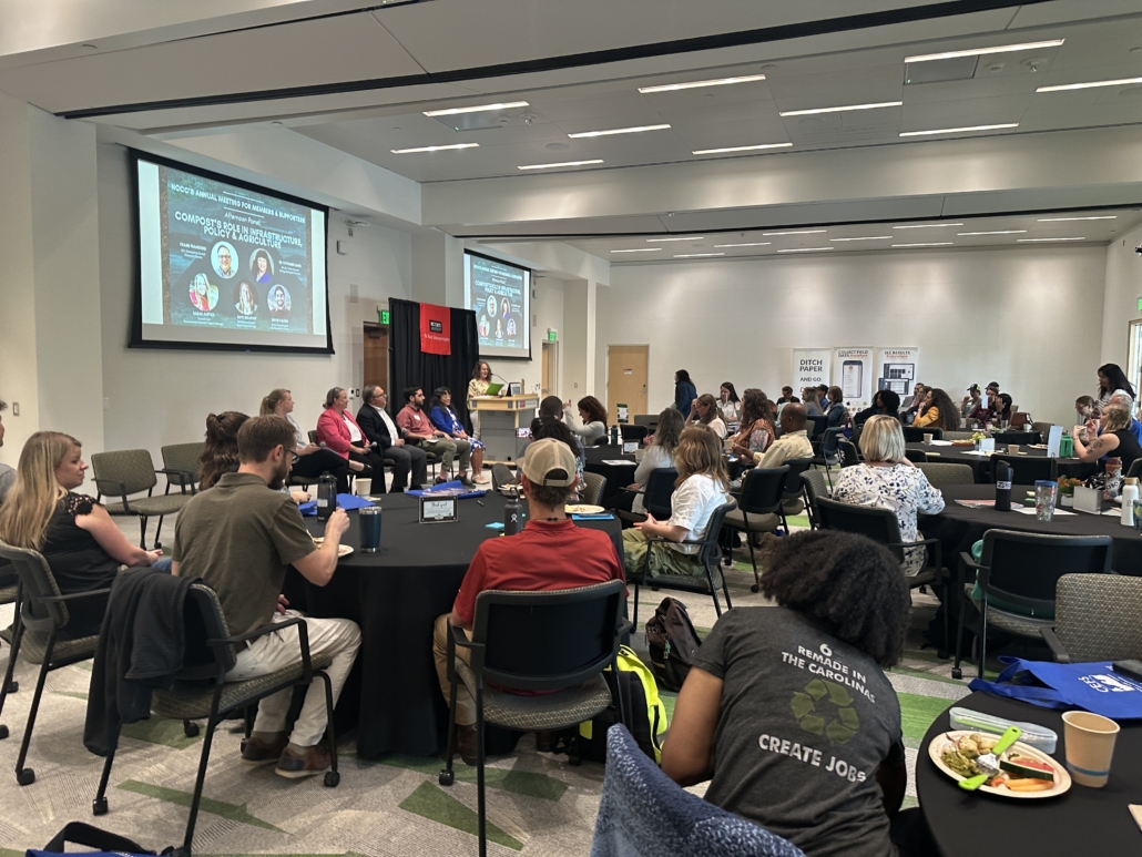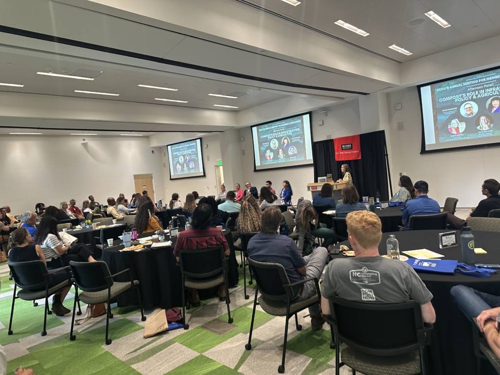 Every year the NCCC holds an event that brings together all of its members, supporters, partner organizations and alums.  In 2023 we joined together in person again at a beautiful site called The Plant in Pittsboro, NC.  The Plant is an inviting place to gather and has grounds and facilities for touring and shopping.   The 2023 annual meeting shared about: the latest science of soil health and how it effects climate change; what the NC Composting Council is doing to teach and expand the manufacture and use of compost in agriculture; and how we’re promoting composting industrially, in communities, and at home. After the meeting attendees enjoyed taking a tour of The Plant, shopping at the Farmers’ Market, and delicious food and spirits. The 2024 and 2025 Annual Meetings were hosted at NC State University’s Plant Sciences Initiative (PSI) Building. NC Composting Council was a founding donor of the PSI and is a proud plant commodity stakeholder.