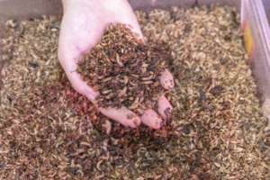 Although Black Soldier Fly grubs and several species of earthworms may be used in vermicomposting, most people use Eisenia fetida (common name: red wiggler). Red Wigglers thrive in warm, moist conditions. They will consume animal manures, food waste, agricultural crop residues, yard trimmings, scrap paper, and other organic byproducts. Vermicomposting can take place anywhere and at any scale – in classrooms, homes, farms, warehouses, etc.