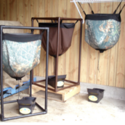 Hanging worm bins can hang in a frame, from a shelf in a closet or from rafters in an attic, basement or shed.  The worms continuously move up to the top of the bag where the food is, allowing you to harvest the compost from the opening at the bottom.   The “compost tea” dripping from below the bag can be collected in a small container.